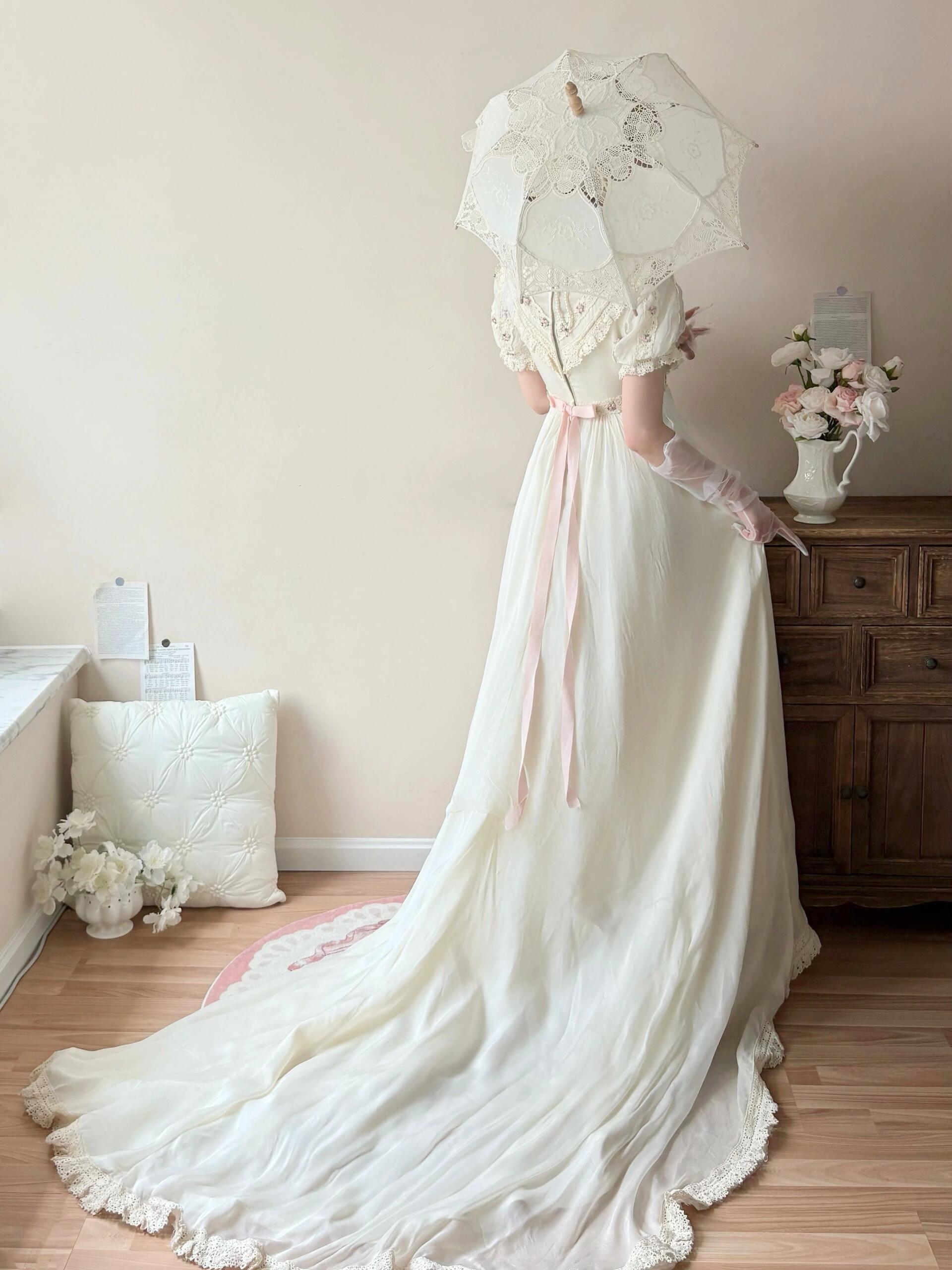 I've never seen a Regency dress with such a generous flare before >w< The train is over two meters long, much longer than what was listed in the description! It's incredibly delicate and absolutely stunning. The only downside is that the bow on the back could be more refined.
