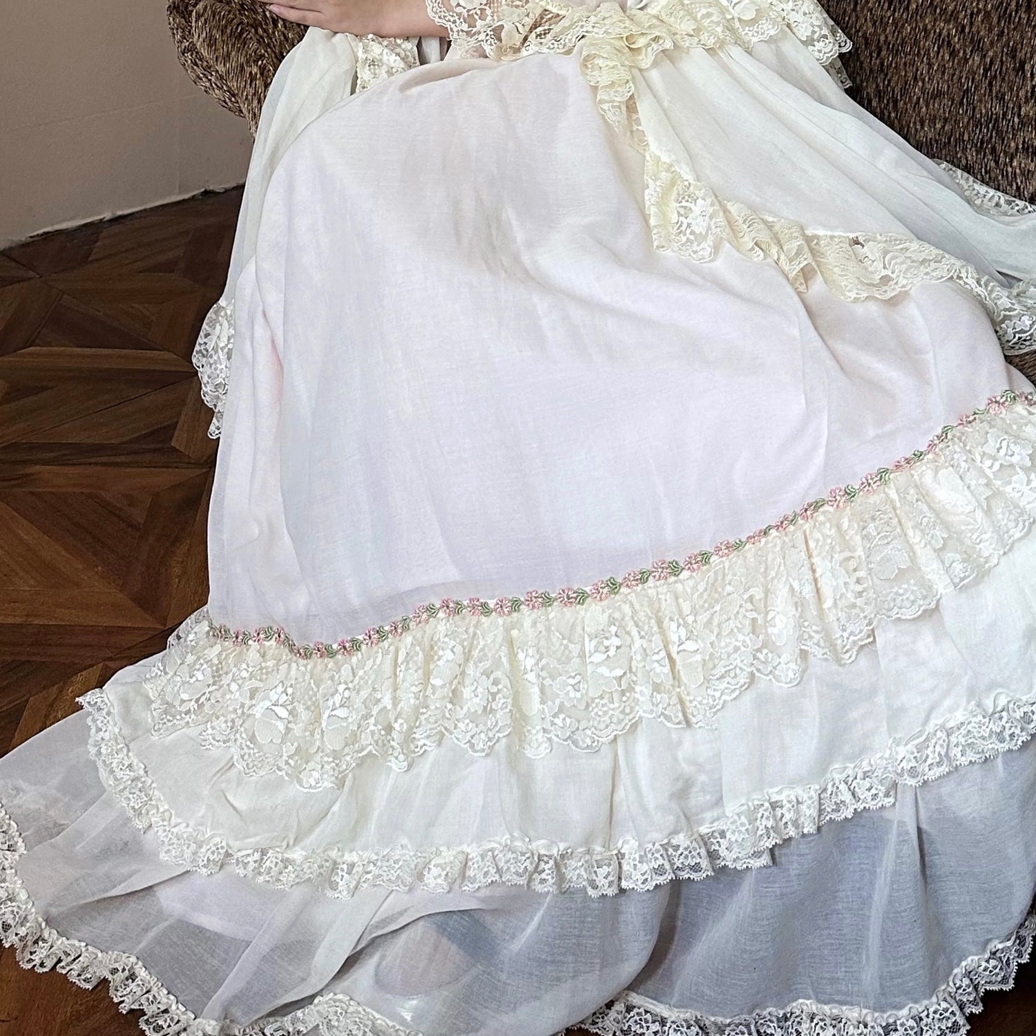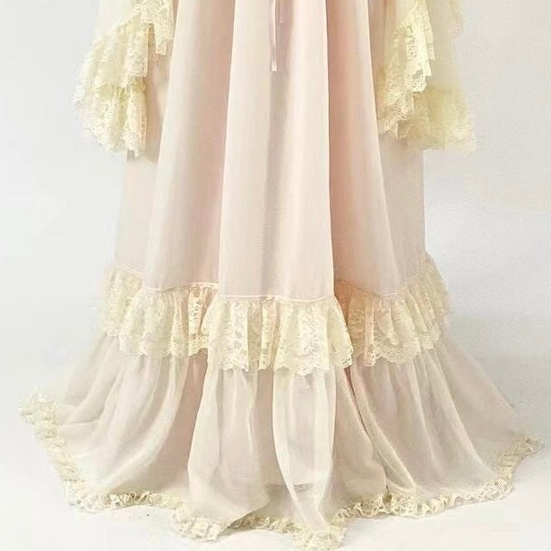 Pink V-neck vintage Victorian-style morning gown with oversized bell sleeves.